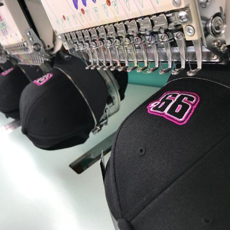 From left-chest polo logos to structured cap embroidery, these are samples of embroidery work produced in-house — digitized, machined, and inspected by our team. Embroidery is available on polos, hats, jackets, uniforms, bags, and more. Minimum 12 pieces.